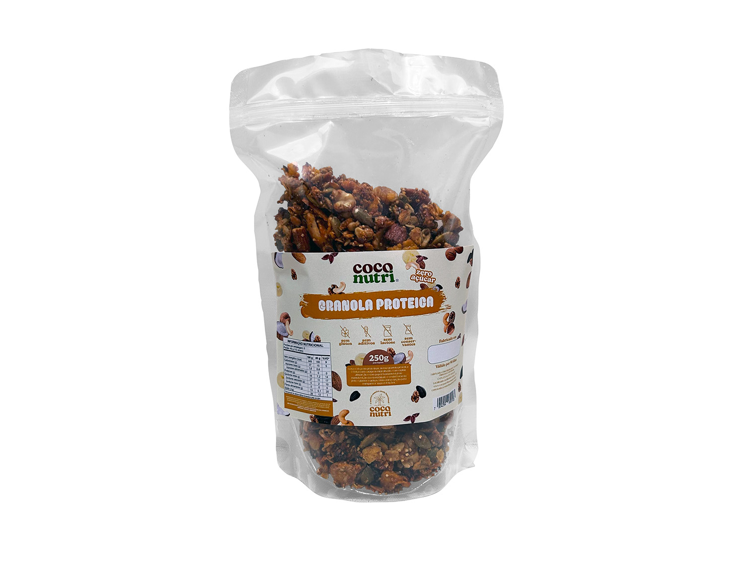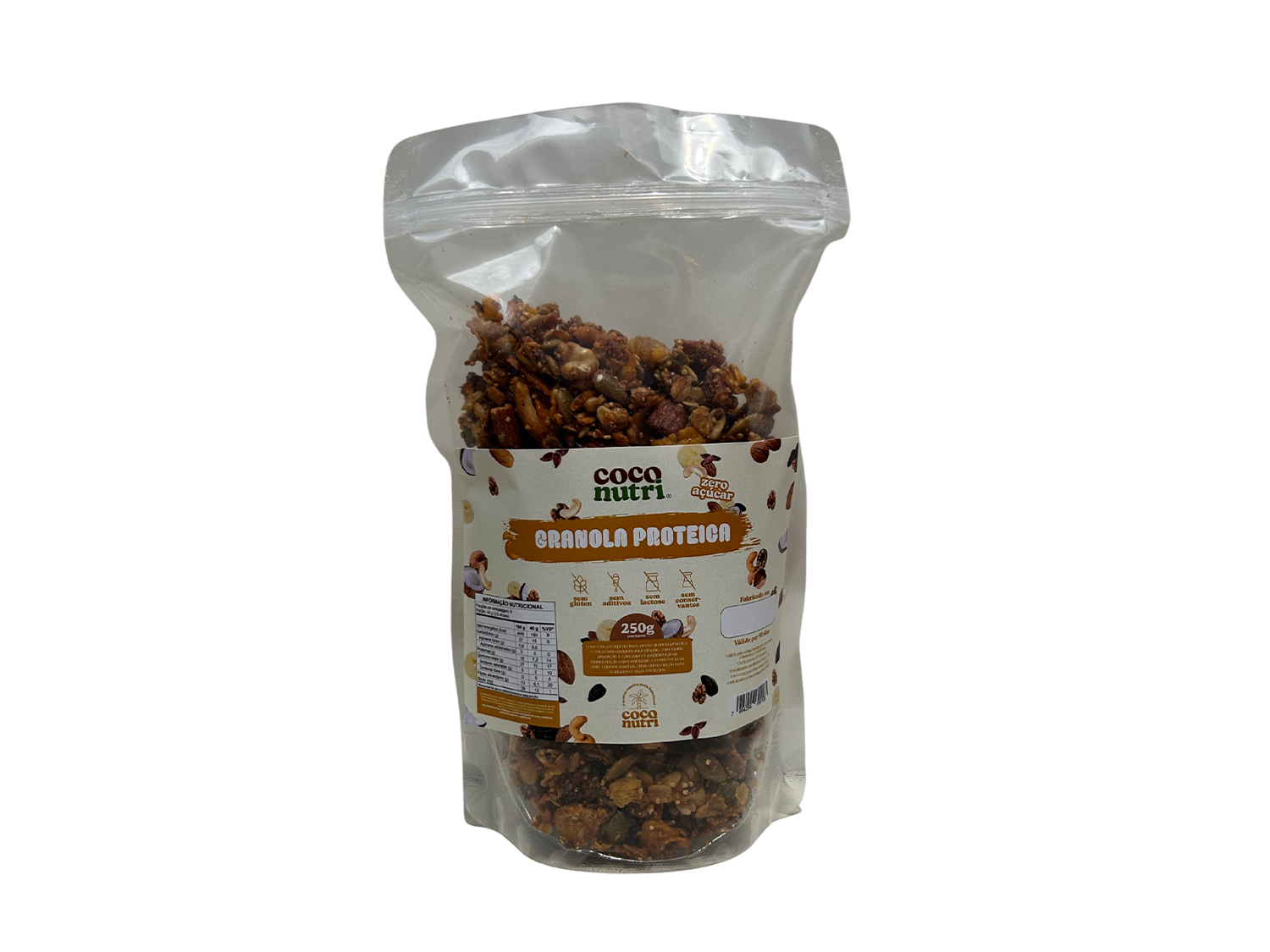 Nossa Granola Proteica é feita com colágeno hidrolisado, de rápida absorção, que ajuda na manutenção da elasticidade e resistência da pele, cabelos e unhas.